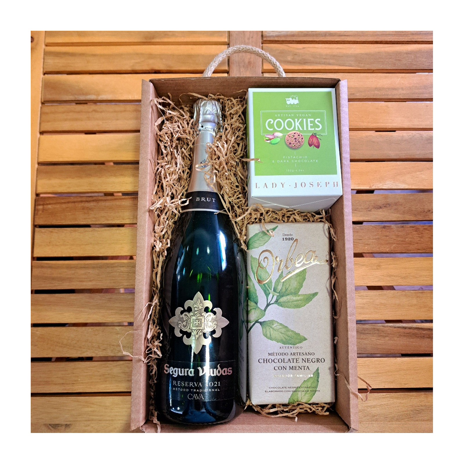 Un estuche pensado para quienes disfrutan de los pequeños placeres. La elegancia del cava Segura Viudas Reserva se combina con el sabor intenso del chocolate negro con menta Orbea y la dulzura artesanal de las cookies de pistacho y chocolate Lady Joseph.