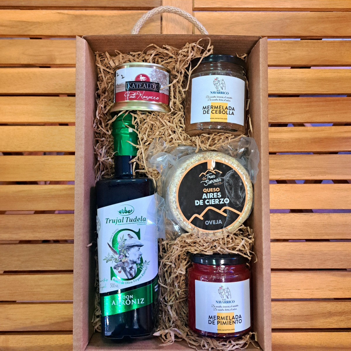 Un estuche gourmet con productos navarros que sorprende por sus combinaciones: queso de oveja con mermelada de pimiento y paté con mermelada de cebolla. Un regalo original y delicioso.